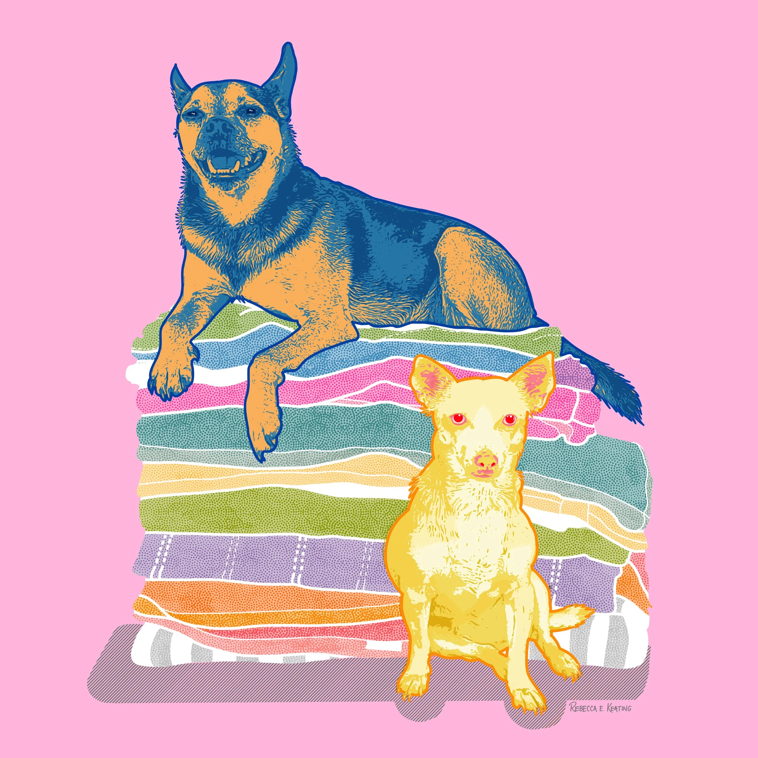 I was asked to create a custom piece of artwork featuring a couple’s beloved dogs. Using an existing photo, I took creative liberties with the color application creating this pop art portrait of their pups.